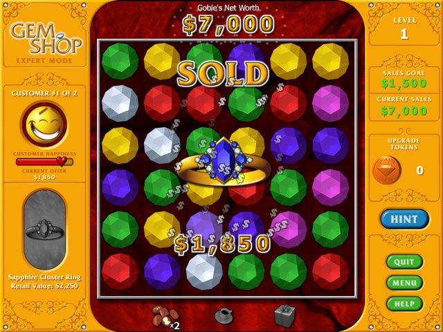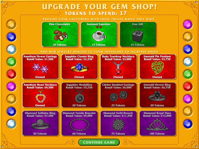 Match colorful gems and keep your jewelry customers happy! Sell gems and jewelry to your smiling consumers, but watch out! Keep them waiting too long and they'll start to grumble. You'll need to give them a marvelous treats to keep them happy (and get the sale)! Special tokens allow you to upgrade your shop with more jewelry and customer-appreciation treats. Remember: Happy customers spend big bucks, and keep your gem shop open for business!